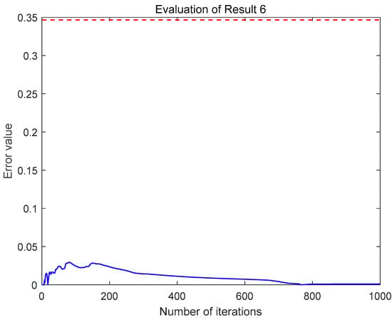 Note that . In the following, the simulation result is based on 1000 iterations. Figure 2 shows the main simulation result. In this figure, the x-axis represents the number of interactions, and the y-axis represents the error value of . The red dashed line represents , while the blue solid line represents . Figure 2 demonstrates that the estimation of for using the upper bound is valid, i.e., Equation (3) holds.