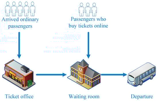 The analyzed two-stage tandem queuing system with priority is inspired by public transportation systems. When taking public transport (e.g., buses, subways, trains, or planes), passengers holding prepaid cards, ride cards, or those who buy tickets online are given priority. They can skip the physical queue at the ticket office and directly access the waiting room. As shown in Figure 1, ordinary passengers initially proceed to the ticket office, join a queue to purchase tickets, and then move to the waiting room to prepare for boarding. Priority passengers who have ride cards or buy tickets online, on the other hand, enter the waiting room immediately. Once the scheduled departure time arrives, all passengers in the waiting room, including both ordinary and priority passengers, board the designated vehicle and leave the station together. The seating capacity in cars, trains, or flights is predetermined and finite. As soon as all seats are filled, the ticket office stops selling tickets, and online ticket purchases are also suspended. This means that when the number of customers in the second stage reaches the threshold, ordinary customers in the first stage are all blocked, and priority customers balk.