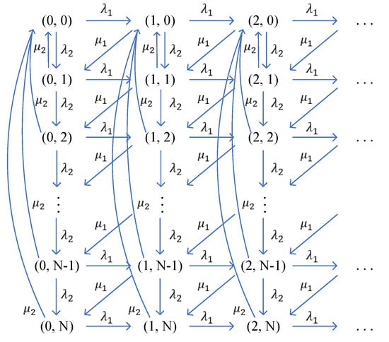 Let and be the number of customers in queue 1 and queue 2 at time t (including the customers being serviced), respectively. Then, the queuing model is formulated as a two-dimensional continuous-time Markov chain with state space
