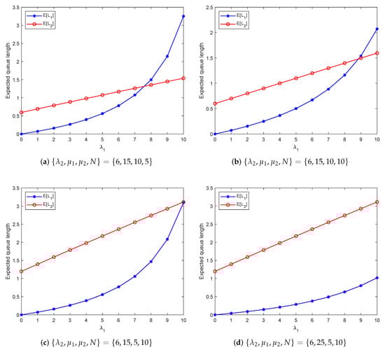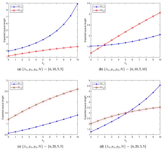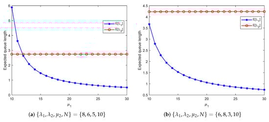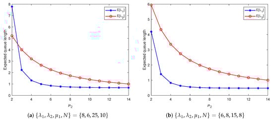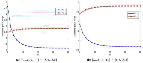 According to Figure 8, it is evident that when , decreases drastically as N increases. However, when , gradually stabilizes with the increase of N. This phenomenon arises due to the limited processing capacity of the second stage when N is small, leading to delays in customers from the first stage entering the second stage, which causes a backlog at stage one. As N increases, the second stage can accommodate more customers, facilitating a quicker transition for customers from the first stage to the second stage. Nevertheless, once N reaches a point where the second stage is no longer a bottleneck, the mean queue length in the first stage is no longer restricted by N. As for , we can see that its change is insignificant and remains relatively stable as N increases. This indicates that the queue length in the second stage is not significantly affected by the threshold N. The reason may be the limitation of the service rate of . Even if more customers can be accommodated, the service capabilities may not match, so the queue length will not change significantly.