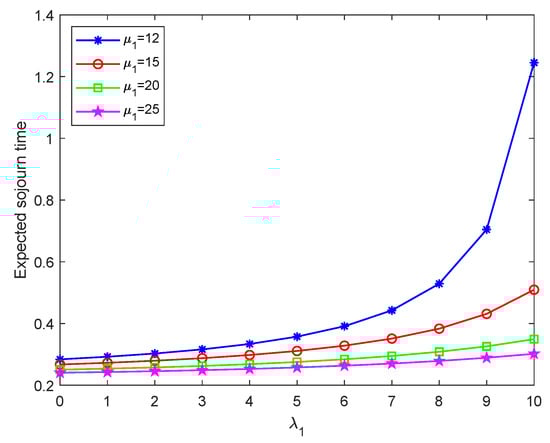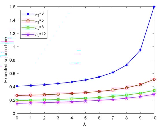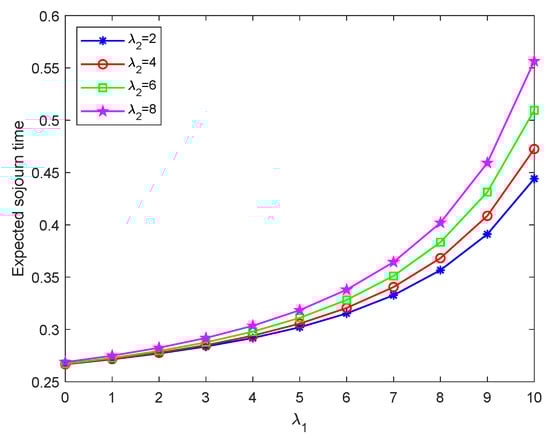 According to Figure 9, when is small (i.e., the arrival rate in the first stage is low), there are not many people in the system, which means the system is not close to saturation. As a result, the expected sojourn time of ordinary customers is relatively short. In such a scenario, even if more priority customers enter the second stage, the system still has sufficient service capability to serve customers, so there is no significant change in sojourn time. However, when is large, the system approaches or reaches saturation. As increases, the second stage becomes busier and may become a bottleneck for the system. This can cause ordinary customers to be blocked in the first stage, leading to an increase in wait time. Consequently, the overall sojourn time in the system increases.