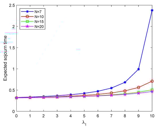 Figure 9, Figure 10, Figure 11 and Figure 12 show the expected sojourn time of ordinary customers in the system with respect to parameters , , , and N as the arrival rate increases from 0 to 10. These figures show that the expected sojourn time of ordinary customers increases with the arrival rate increase. Because more ordinary customers reach the first stage, newly arrived ordinary customers need to wait longer to receive the first stage of service, therefore increasing their overall sojourn time in the system.