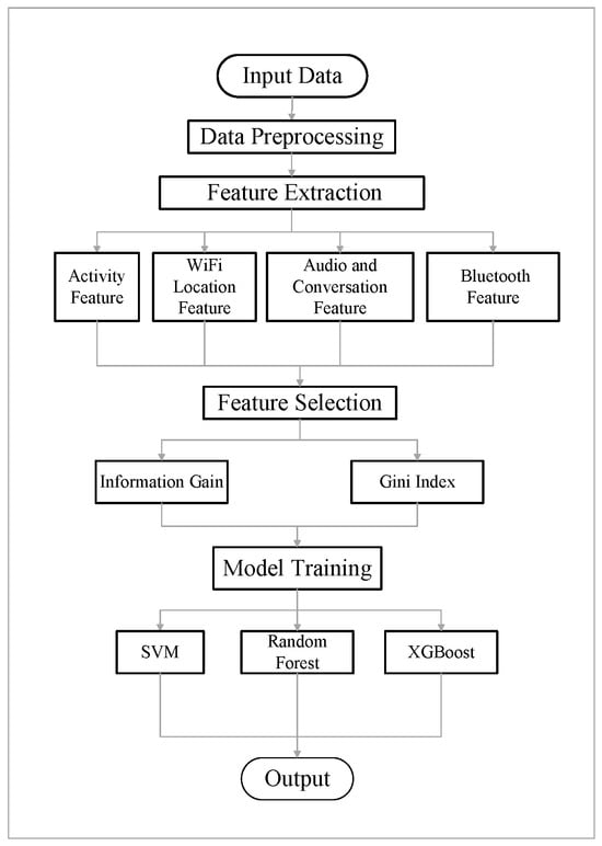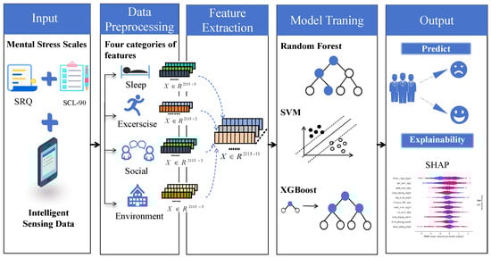 First, we integrated factors delineated in the Stress Reaction Questionnaire (SRQ) [4] and the Symptom Checklist-90 (SCL-90) [15] to analyze sensory data collected from smartphones. Then, we identified specific feature categories for extraction, encompassing sleep, exercise, social interactions, and environmental influences. After that, a meticulous feature selection process was undertaken to ensure the relevance of the chosen features to mental stress. In the model training stage, the selected features were inputted into classic machine learning models. Ultimately, this model produced predictions of mental stress levels. To enhance the model’s interpretability, we employed the Shapley additive explanations (SHAP) model to dissect the contribution of each feature to the predictive outcomes. Figure 2 shows the flow chart of the algorithm.