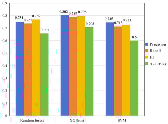 This article employed ten-fold cross-validation to randomly partition the data into 10 subsets, with 9 subsets allocated for training and 1 for testing. We employ the ADASY (Adaptive Synthetic Oversampling) [28] method to balance positive and negative samples, aiming to alleviate the learning bias caused by the imbalance in the original data distribution. Additionally, it adaptively adjusts the decision boundary to prioritize learning from more challenging samples. For 11 dimensional features, three models are used for training and testing, namely random forest, XGBoost, and support vector machine. The experimental results are shown in Figure 4.