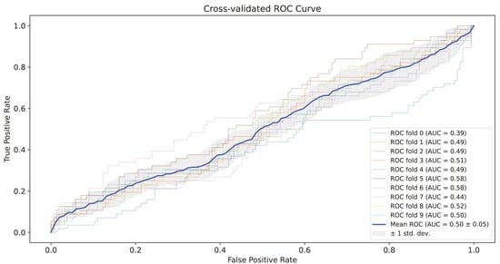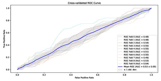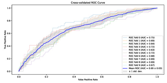 Among the above three models, the XGBoost model has the best performance (Precision = 0.802, Recall = 0.789, F1 = 0.795, Accuracy = 0.708). The XGBoost model has higher Precision and F1 than the random forest model, but the random forest and XGBoost are closer in terms of Recall. The least effective among the three models is the SVM model. However, the three indicators of the SVM model are all above 0.7, indicating that the extracted features can reflect the mental stress of college students. By observing the AUC-ROC curve (Figure 5, Figure 6 and Figure 7), it can be observed that XGBoost performs the best.