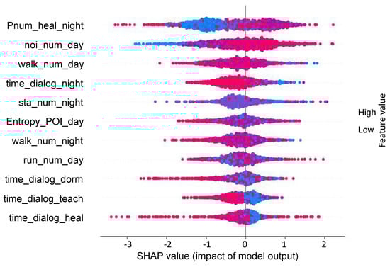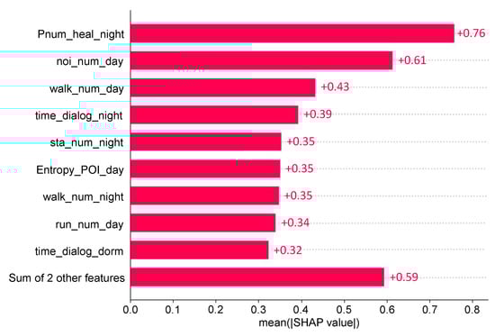 Features in Figure 9 are sorted by their impact on model predictions. The mean (|SHAP value|) value reflects the relative relationship of feature importance. In this case, the number of nights in the extracurricular area is the most important feature. The feature importance of other dimensions decreases in sequence.