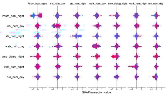 SHAP interaction values are the interaction attribution values between two features, which are used to capture the pairwise interaction effect. In Figure 10, the X-axis represents SHAP values, and the Y-axis represents the types of features. Each point on the chart is a SHAP value. Red indicates higher feature values. Blue indicates lower feature values. You can get a rough idea of the directional impact of a feature based on the distribution of red and blue points.