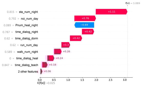 The contribution of each feature to the first prediction can be obtained from the waterfall chart in Figure 11. When the SHAP value is greater than zero, it means that the feature improves the predicted value and has a positive effect; on the contrary, it means that the feature reduces the predicted value and has a negative effect. The number and span represent the contribution of the feature to the classification.