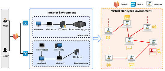 A honeypot is a proactive, aggressive network spoofing defense technology. It is able to simulate real services to attract attackers to attack and collect attack data, analyze attack behavior, and protect real systems from attacks [24,25,26]. A network environment where multiple honeypots are intricately deployed is known as a honeynet. As shown in Figure 1, when the attacker accesses a normal intranet environment, malicious attacks are introduced into the honeynet environment through techniques such as IP redirection. Honeypots guide attackers to roam within the honeynet by responding reasonably to attack requests. This enables effective capture of attack information and defense operations such as tracking.