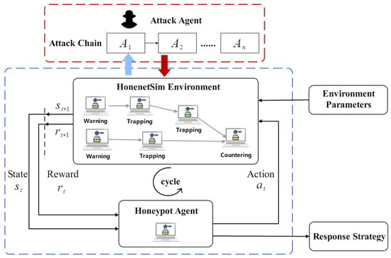 There is much research on honeypots focused on emulation improvement. For example, this is often accomplished by enhancing the authenticity of honeypot operating systems, applications, and their vulnerabilities [4,5,6] to match existing business systems. However, simply enhancing the simulation of honeypots is limited when considering the persistence of attack interactions, which lacks any modeling of attack response actions. More attention is useful in the generation of rational response strategies for honeypots. During attack and defense games, a honeypot is able to generate and adjust its response strategy through learning, which directly affects the maintenance of the interaction relationship. Thus, modeling attackers is an effective way to enhance the honeypot interaction. Recent research has typically modeled the attacker as part of the environment and defined single-step attack actions by simulation, which can simplify the complexity of real attacks and does not adequately express the variety of attack strategies and behaviors. This makes it difficult to realistically describe the mechanisms associated with an attack. For instance, in [7], attackers are modeled into custom network environments, and the generated attack strategies are not sufficiently reflective of real attack characteristics and are difficult to apply to other network scenarios. Meanwhile, most of the current attack action modeling used to train honeypot agents is mostly independent and cannot constitute a complete attack chain. In [8], the authors focus on honeypot techniques for SQL injection and XSS attacks and do not consider response strategies under the correlation of actions in a complete attack chain. These limitations result in an insufficient interaction of the response strategy generated by the honeypot, making it difficult to establish a continuously interactive connection with attackers in a dynamic environment.