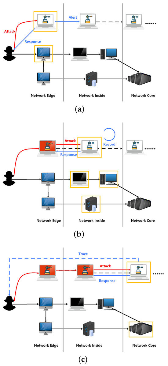 Honeypot classification: (a) warning honeypot deployment; (b) trapping honeypot deployment; (c) countering honeypot deployment.
