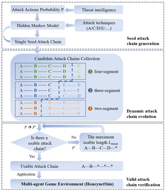Attack agents can automatically and quickly generate valid attack chains. This process can be divided into three main phases, seed attack chain generation, dynamic attack chain evolution, and valid attack chain verification. In this paper, we generated a seed attack chain based on an HMM accomplished by orchestrating attack techniques, dynamically evolved the attack chain based on the seed chain, and stored it in the candidate attack chain collection. Finally, valid attack chains were quickly verified under the honeynet scenario interaction. The specific steps for generating valid attack chains are illustrated in Figure 5.