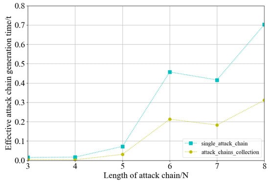 Attack agents have the goal of generating a complete attack chain that is effectively usable. Our proposed method of generating a valid attack chain based on a collection of candidate attack chains can quickly obtain a valid attack chain and thus improve the efficiency of attacks. By simulating honeynet environments with different configurations, we conducted experiments under the scenarios of generating attack chains of 3–8-step actions, respectively. The experimental results are shown in Figure 7. By analyzing the experimental results, we found that in attack chain generation with fewer attack steps, the single attack chain generation method did not differ much from our generation method in terms of generation time. However, as the number of attack steps included in the attack chain increased, the advantage of our method gradually expanded. This is because as the complexity of generating attack chains increased, the number of calls to the HMM for a single attack chain generation method increased significantly, increasing the generation time. Our method selected valid attack chains from the candidate attack chain collection and made partial adjustments, so it could improve the generation efficiency. Overall, our method could output a valid complete attack chain much faster than the single attack chain generation method.