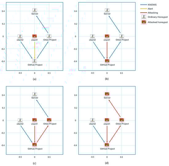 The interaction process of honeypots and attacker. (a) Communication alarm; (b) threat records-1; (c) threat records-2; (d) traceability and countermeasures.