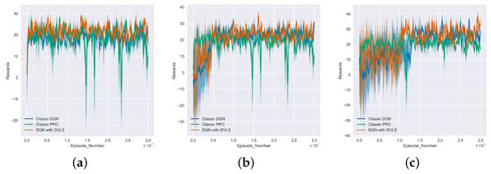 We compared and analyzed three different algorithms in a honeynet scenario containing five honeypots, six honeypots, and seven honeypots of different complexities. This also corresponded to the modeling of attack agents generating attack chains of different lengths. The results are shown in Figure 10. From Figure 10a, we can see that the DQN with DVLS in the early stages had comparable utility to the DQN, which continuously improved and eventually remained stable as the training proceeded. After 1000 episodes, the convergence of all methods tended to stabilize. Compared to the other methods, the DQN with DVLS achieved faster convergence and the highest cumulative reward. From Figure 10a–c, as the complexity of the honeynet environment increased, the convergence of the DQN with DVLS was always the best. This shows the efficiency and stability of the DVLS sampling method, which is attributed to the efficiency of its sampling method. Since the DQN with DVLS labels the value weight of stored data, it allows a more efficient selection of samples for learning. Overall, the PPO algorithm learned more efficiently at the start of training, but it was more volatile as training continued. This may be related to our discrete state-action space environment.