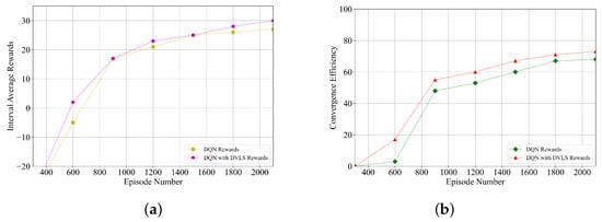 Comparison of average reward and convergence efficiency: (a) average cumulative reward values; (b) average convergence efficiency.