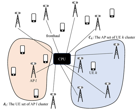 To address this, the concept of a CF-MIMO network has emerged. A CF-MIMO network is a network where geographically distributed APs jointly serve UEs, and APs are connected to the CPU by front-haul links. The advantage of a CF-MIMO network is that it reduces the propagation distance between APs and UEs, ensuring good signal quality regardless of UE location [6,7,8,9].