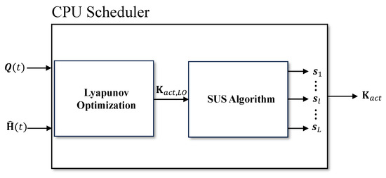 Figure 3 illustrates the scheduling process of the CPU scheduler. At time slot t, if , estimated at the APs, and are utilized, UEs are scheduled in the Lyapunov optimization phase, and this set of UEs is denoted as . If UEs are served, it can maximize network throughput performance [13]. Among , the set of UEs that the AP needs to serve is denoted as , and it can be obtained as . If for AP , the SUS algorithm is applied for rescheduling. The finally scheduled UEs by AP are represented as , and the scheduled UEs in the network are denoted as . The CPU determines the effective data rate with the estimated CSI. First, the CPU computes the mutual information for each UE as follows: