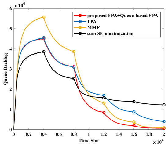 Queue backlog comparison across time slots for FPA + queue-based FPA with , FPA with , MMF, and sum SE maximization.