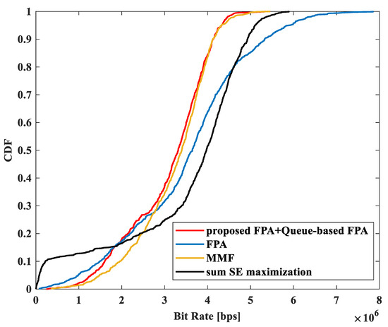 CDF of throughput comparison for FPA + queue-based FPA with , FPA with , MMF, and sum SE maximization.