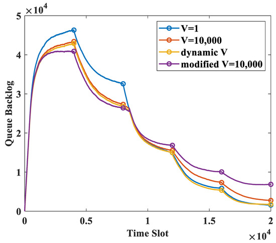 Queue backlog with varying control parameter V.