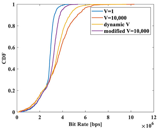 Figure 6 compares the queue stabilization performance of the four scheduling methods. When traffic is high, the performance of dynamic V is similar to that of V = 10,000. However, in the case of modified V = 10,000, UEs with an effective rate larger than the queue backlog are not scheduled, leading to more efficient removal of the system queue backlog. When traffic is low, the performance of dynamic V is similar to that of V = 1, indicating that the proposed dynamic V approach flexibly performs queue stabilization scheduling depending on traffic conditions. However, modified V = 10,000 exhibits lower performance in low-traffic scenarios. In low-traffic situations, there are fewer UEs with queue backlogs larger than their effective rates, reducing the ability to remove the queue backlog.