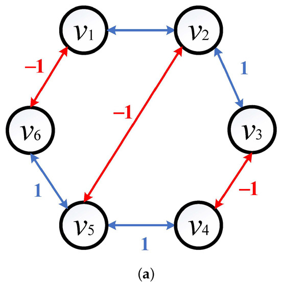 We consider the system (1) whose communication topology is described by Figure 2a. We can easily see that the signed graph is structurally balanced and all nodes can be divided into two groups: and . The Laplacian matrix of is given by