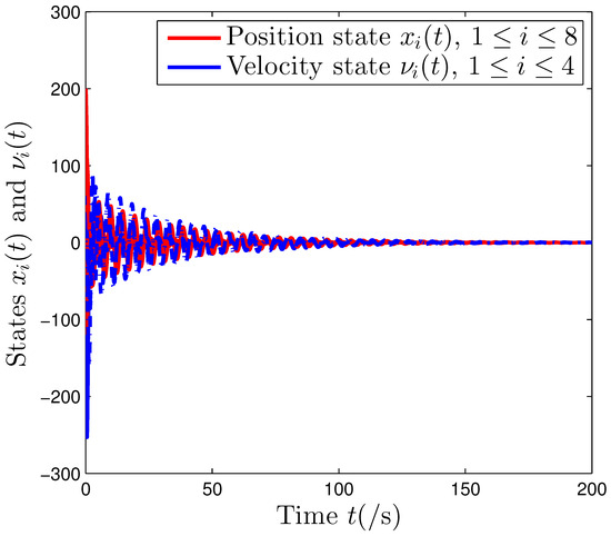 From Figure 4, it can be observed that when the communication topology is structurally unbalanced, the positional states of eight agents (as indicated by the red lines) and the velocity states of four agents (as indicated by the blue lines) eventually converge to zero under the control of the distributed protocol (2), which denotes that the system (1) can reach the state stability. Hence, these derived results satisfy Theorem 1.