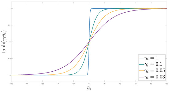 To further alleviate the communication pressure while systems’ performance is guaranteed, an ASETC is constructed based on a modified hyperbolic tangent function as . When the input signal is smaller, such as , the relative threshold strategy is chosen so that control performance can be guaranteed without taking up too many resources. When the input signal is large, such as , the triggered threshold is constructed based on a modified hyperbolic tangent function. By selecting the suitable modified parameter , as shown in Figure 1, which depicts the changing tendencies of the modified hyperbolic tangent function while the input signal and the coefficient change, a more reasonable trigger threshold can be obtained. Therefore, the balance between systems’ performance and the network resources can be accomplished.