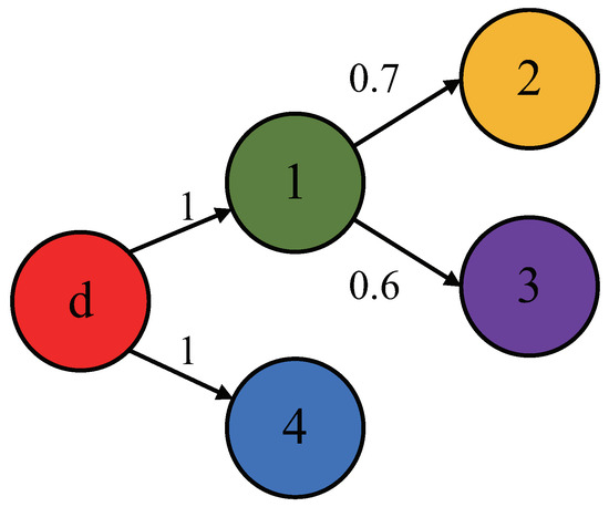 Applying to express the fixed directed information exchange topology among multiagent systems (similar to [40,44]). Then, the is the set of virtual leader and agents , is the edge set from the j-th agent to the i-th agent. is the weight of the edge between the i-th agent and the j-th agent, then the weighted adjacency matrix among the agents is directed by . If the j-th agent can receive information from the i-th agent, the edge weight is ; otherwise, . Besides, is the weight of the edge between the leader and the i-th agent, then the weighted adjacency matrix can be described as . If the i-th agent can receive information from the leader, then . Otherwise, . The in-degree diagonal matrix can be presented by , where . The Laplacian matrix of can be defined as . Noting that at least one agent exists that can obtain information from the leader that , which guarantees that can be nonsingular. Then, exists for a certain path that can always reach each node from the root node .