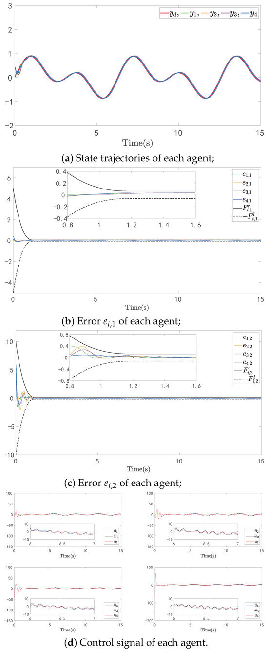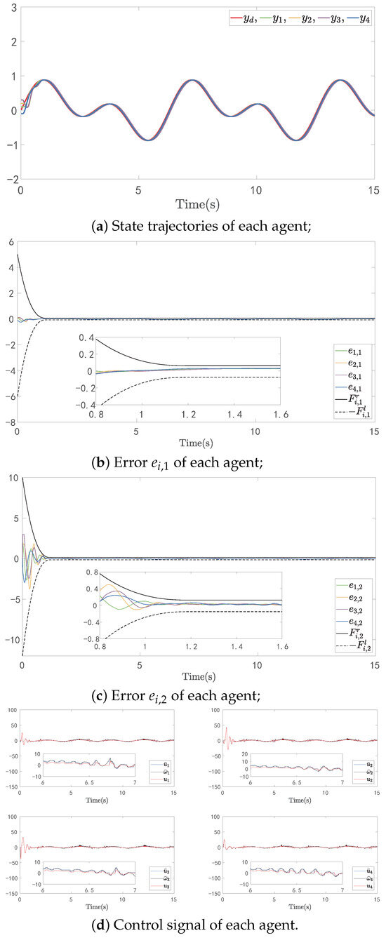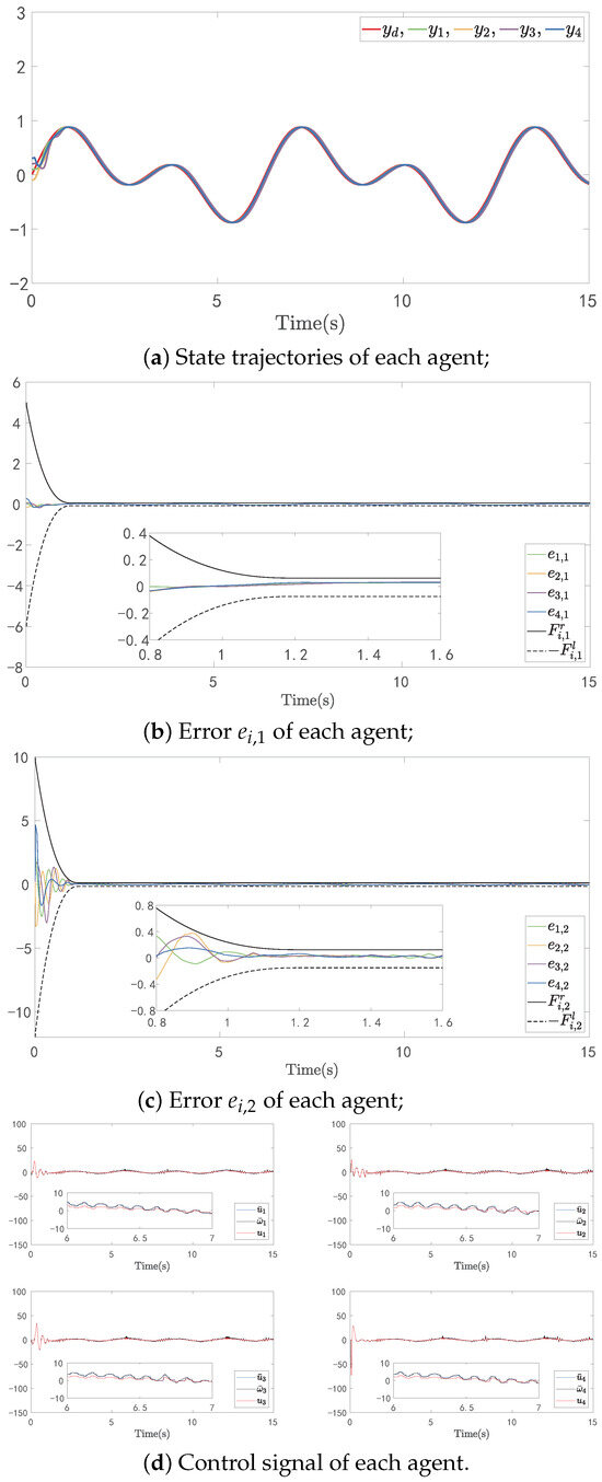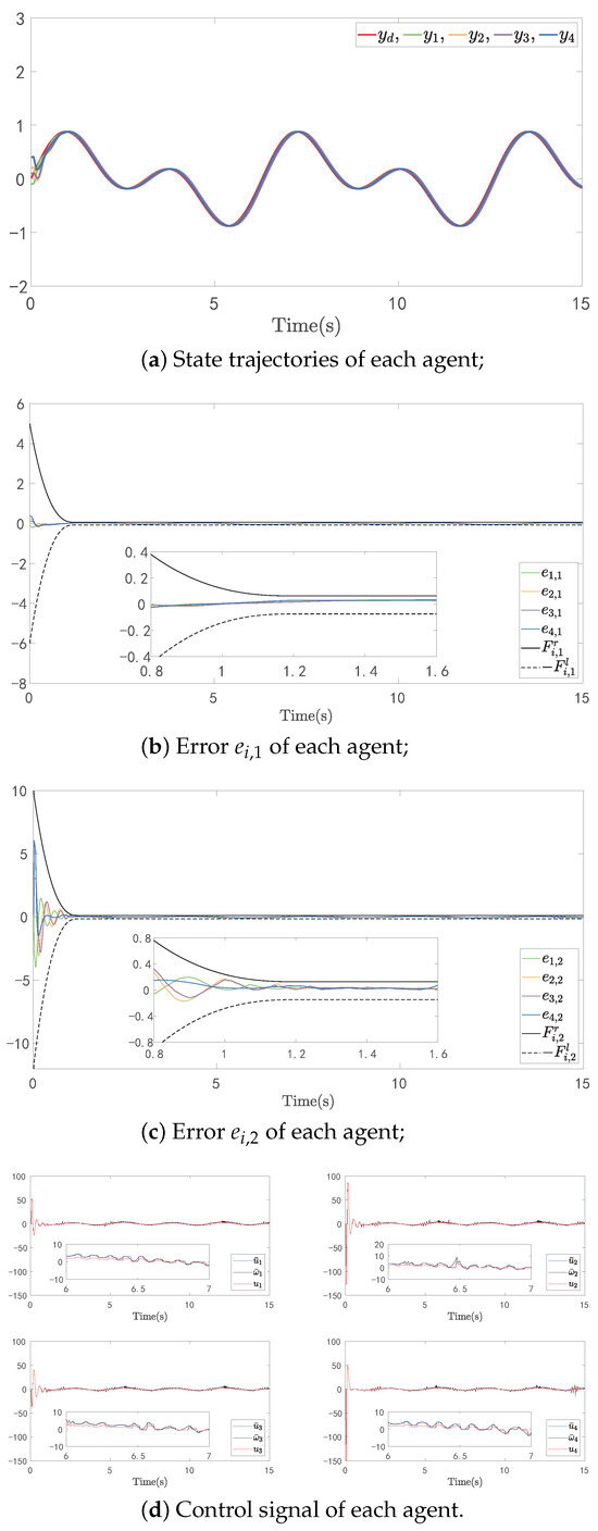 The simulation results of the numerical example in case I are presented in Figure 3. Figure 3a displays the output trajectory of the manipulated system that consists of one virtual leader and four agents. Figure 3b,c denotes the first-order error and the second-order error of the system, respectively. Figure 3d depicts the three kinds of control signals , and of each of the four agents.