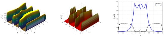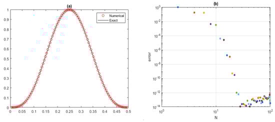 The comparison between the numerical and exact solutions, as well as the convergence of the Fourier spectral method, is shown in Figure 1 for with step size and . □