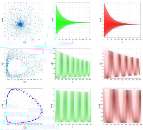 Then, for every , and by following the criteria of Bendixson–Dulac as applied in Jiang and Wang [19], it was shown that there was no close orbit. In addition, we consider conditions for the stability and existence of the interior point , to show that is globally asymptotically stable if its parameters satisfy the conditions: