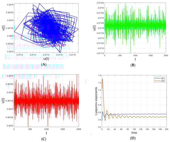 Plots (A–C) depict complex or chaotic-like interaction between the prey and predator populations at final simulation time . Plot (D) gives the Lyapunov exponents of both species at and .