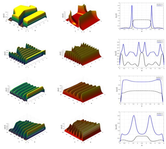 Dynamic distribution of fractional reaction–diffusion system (37) showing chaotic-like and complex spatiotemporal behavior of the prey and predator populations for different instances of at with . Rows 1 to 5 correspond to , respectively.