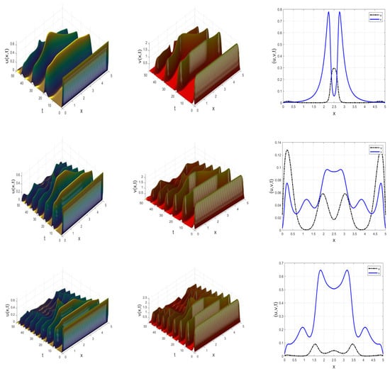 Snapshot of dynamic system (37) showing chaotic-like and complex spatiotemporal behavior of the prey and predator populations for different instances of and at . Rows 1 to 3 correspond to , respectively.