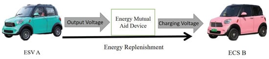 Using the vehicle–vehicle energy mutual aid device can solve the problem of “mileage anxiety”. In long-distance driving, if there is no suitable charging pile around to charge the electric vehicle in time, the vehicle–vehicle energy mutual aid device can be used to seek energy replenishment from the surrounding electric vehicles with sufficient energy. The output voltage of the energy-supplying vehicle (ESV) is used as the charging voltage of the energy-consuming vehicle (ECV). The device can be used as a road emergency device for vehicle owners, and it can be carried with the electric vehicles, significantly increasing the flexibility of the charging mode of electric vehicles and eliminating the charging problem (Figure 1).