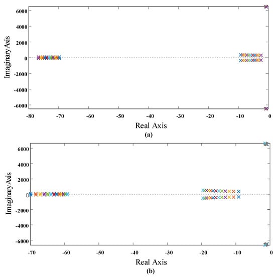In the first case, the input voltage 90 V, the output voltage is changed from 200 V to 250 V, and the eigenvalues of the system are shown in Figure 3a. In the second case, the output voltage 250 V and the input voltage changes from 90 V to 150 V. The eigenvalue distribution is shown in Figure 3b. The output power is stabilized at 3 kW. All the eigenvalues shown in the figure are distributed in the left half-plane of the system; i.e., all the eigenvalues of coefficient matrix A have negative real parts, and the system is stable at the equilibrium state.