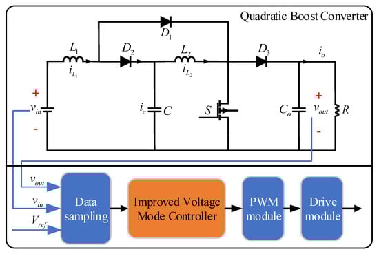 Some voltage-mode controllers were also proposed for higher-order boost converters [23,24], whose structures were based on the simplified parallel-damped passivity-based controllers (PBCs) of conventional boost converters [24]. These voltage-mode controllers required only the voltage signal of the measured load as a feedback signal, significantly reducing the use of sensors. However, among such controllers in [23,24], there were still many problems regarding the voltage mode controllers necessary to be solved because of the use of traditional proportional–integral action, the tradeoff of the transient response performance index when the input signal was interfered with, and the possibility of zero division of the control signal. Based on this, this paper adopts an improved voltage mode controller based on the existing voltage mode controller, which no longer integrates the output voltage error signal and avoids the risk of dividing the control signal by zero. Therefore, the output performance of the controlled converter system is improved. At the same time, the gain width of the controller’s output is significantly increased, making the device significantly more practical.