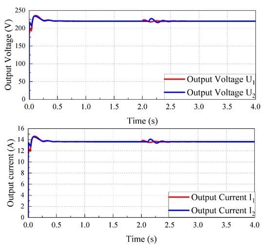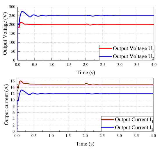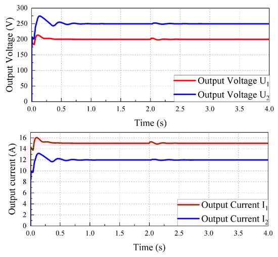 Figure 6. The voltage and current of the device in case 2.As and show in Figure 6, when the BaoJun e100(A) is charged for the Hongguang MINIEV, 250 V, maximum overshoot 9.2% (less than 10%), and regulation time 0.22 s. When the simulation proceeds to 2s, can recover to 250 V quickly when a 20% perturbation of occurs. The system has strong robustness. The output voltage 3 kW.So, by the same argument, the simulation of choosing the BaoJun e100(A) for the BaoJun e100(B) and the Hongguang MINIEV charging can prove the effectiveness of the device. - Case 3:In contrast to the two cases above, in this case, the Hongguang MINIEV and the Baojun e200(A) are taken as ESVs and the Hongguang MINIEV and the Baojun e200(A) are taken as ECVs. According to the parameters in Table 1, the input voltage of the vehicle–vehicle energy mutual aid device is 96 V/122 V, i.e., 96 V/122 V, and the output voltage is 220 V. The reference voltage 220 V.As shown in Figure 7, the Hongguang MINIEV powers the Baojun e200(A) (), and the Baojun e200(B) powers the Baojun e200(C) (), corresponding to an overshoot % of 6.8%/6.4% and regulation time 0.17 s/0.16 s, respectively. When the simulation proceeds to 2 s, the output voltage and current can quickly recover to the set value when a 20% disturbance of occurs.
