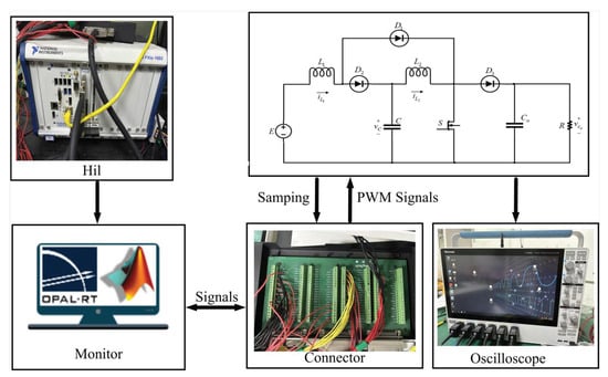In order to verify the effectiveness of the quadratic boost converter controlled through a modified voltage-mode controller for energy mutual aid devices between electric vehicles, the controller hardware-in-the-loop (HIL) experiment is conducted in a real-time simulation system. The detailed topology of the HIL experiment is shown in Figure 8. The emulator consists of a CPU and FPGA. Through the host computer, the control algorithm from the controller is downloaded to the CPU in the simulator to generate control signals; the circuit model is loaded into the FPGA inside the simulator. The FPGA contains the system model of the power electronic components, which enables the real-time simulation of the circuit model. At the same time, the FPGA can internally generate PWM signals. In the simulator, the CPU and FPGA are connected through a bus to realize the self-closed loop simulation. In this case, the control frequency is 5 kHz.