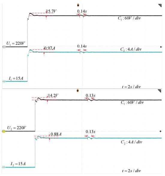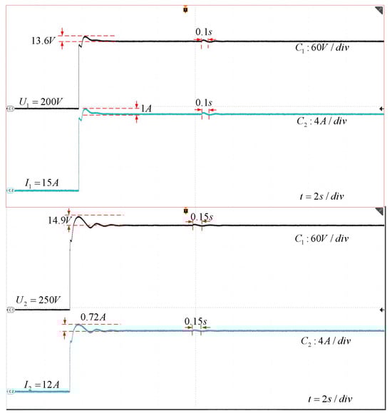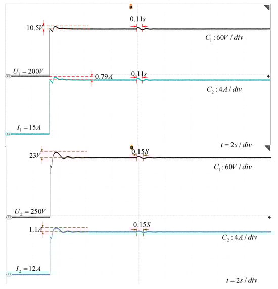 Figure 10. The actual output voltage and current of the energy interaction converter under HIL experiment in case 2. - Experiment 3:Experiment 3 is based on case 3. The experimental results are shown in Figure 11. Hongguang MINIEV and Baojun e200(A) are selected as ESVs, and BaoJun e200(B) is selected as ECV. The output voltage of Hongguang MINIEV and Baojun e200(A) is 96 V/22 V, respectively, and BaoJun e200(B) requires a charging voltage of 220 V. From the experimental results, the energy mutual aid device can quickly generate the voltage needed for ECV, the amount of overshoot generated is less than 10%, and the device quickly returns to stability when receives a perturbation at 2 s. The experimental results prove the effectiveness of the device.