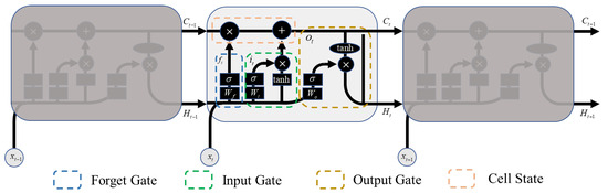 In the CNN-LSTM model, the data processed by steps (3) to (6) or other unprocessed time-series data can be passed to LSTM to extract the temporal features. RNN contains the hidden state , and LSTM is optimized on the basis of RNN with the addition of the unit state and three gate structures, which are the forget gate, the input gate, and the output gate.