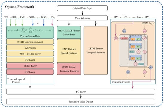 The structure of this paper is as follows: Section 2 introduces the principles of the econometric model RR-MIDAS and the deep-learning model CNN-LSTM-P, comprehensively summarizes the evaluation criteria and the principles of the DM test, and then details the research process. Section 3 introduces the data sources, basic data characteristics and Optuna tuning framework, argues the correlation between explanatory variables and volatility, and demonstrates the optimal hyperparameters of the RM-CNN-LSTM-P model under the Optuna tuning framework. The test set volatility prediction accuracies and rankings of 18 volatility prediction models under six loss functions are further compared, and finally, influence experiments and DM tests are conducted to argue the importance of the three macro-variables in improving the prediction accuracy of the models, and to verify that the RM-CNN-LSTM-P model is significantly better than the other models. Section 4 discusses the difference in prediction performance between this paper and the linear interpolation model, and the parallel LSTM model with CNN removed, and Section 5 provides conclusions and extensions.
