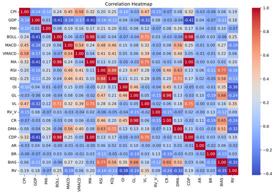CPI, GDP, and PMI data were obtained from Sina Finance (https://finance.sina.com.cn/, accessed on 13 May 2024). RV, BIAS, DMA, CDP, AR, BR, RV_V, and CR were calculated from the trading volume, overnight spreads, turnover rate, and other data related to the SSE index, and the basic data related to the calculations were obtained from the Wind database. SSE BOLL, MACD, VMACD, MA, RSI, KDJ, GL, VL, and OI were obtained from the Wind database.