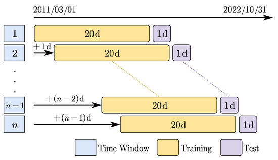 In the above equation, x and y are eigenvectors, and and represent the mean and standard deviation of the corresponding variables, respectively. This paper scrolls through the past 20 days of historical data to predict the next day’s realized volatility, as shown in Figure 5.