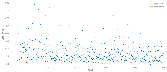 In the Optuna tuning process, each trial tries to minimize the loss metric and calculate various error metric values. In this paper, we set the number of experiments, , and the return value is the loss MAE value of the model on the validation set. The hyperparameter optimization process of the RM-CNN-LSTM-P model is shown in Figure 6, where the horizontal coordinate represents the number of experiments, the vertical coordinate represents the MAE value, the blue dots represent the MAE at the end of one experiment, and the red line represents the minimum loss value up to each experiment before the experiment is carried out up to 500 times. Table 2 demonstrates the hyperparameters of the RM-CNN-LSTM-P model after Optuna framework tuning.