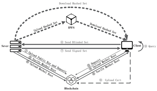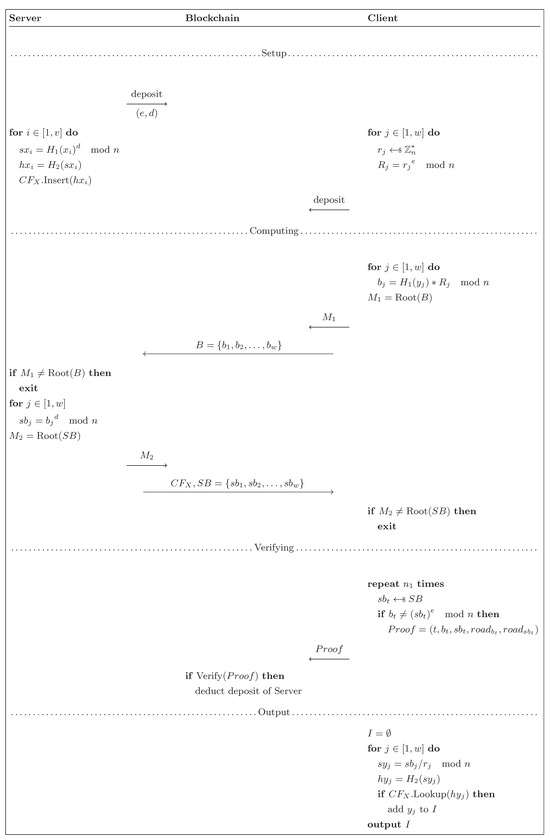 - The server signs every element in B to generate set using the private key , where . It then uploads the Merkle root of to the blockchain and sends set and the Cuckoo filter to the client.