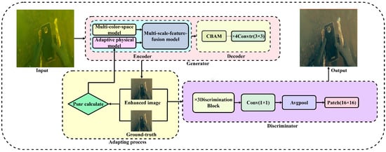 AMSMC-UGAN, illustrated in Figure 1, employs an encoder–decoder generator. The input image undergoes restoration based on a physical model and a conversion to Lab and HSV color spaces, generating respective outputs. The network selectively applies physical model-based restoration algorithms, including total variation [14], dark channel prior [6],contrast improvement based on inverse filtering [15], and resolution reconstruction via sparse representation [16], then the underwater depth estimation parameters of the image were estimated by the underwater physical model and transmitted to the multi-scale module of the image as a fusion factor of the deep learning model, as shown in line 23 of Algorithm 1, to guide and constrain the deep model’s output. Next, the multi-scale module processes various color spaces and employs attention mechanisms to enhance critical features, significantly improving the model’s performance. The output undergoes up-sampling and reconstruction using deconvolution layers.