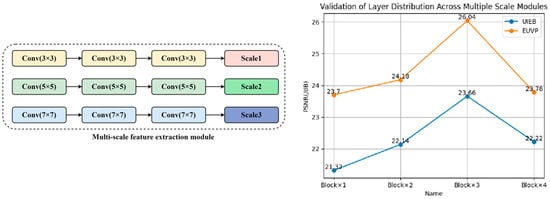Multi-scale feature extraction fusion module This study inputs images processed through three color spaces and a physical model into a multi-scale feature extraction module for feature extraction. Figure 4 illustrates the structure of the multi-scale feature extraction module, where scale1, scale2, and scale3 correspond to feature extraction at large, medium, and small scales respectively. Each scale extraction block consists of three convolutional layers (Conv2d), differing in kernel size, stride, and padding parameters. Specifically, all Conv2d layers in scale1 have a kernel size of 3 × 3, stride of 1, and padding of 1; all Conv2d layers in scale2 have a kernel size of 5 × 5, stride of 1, and padding of 2; and all Conv2d layers in scale3 have a kernel size of 7 × 7, stride of 1, and padding of 3. Additionally, the number of channels for each scale changes progressively from an initial 3 channels to 16 channels, then to 32 channels, and finally to 64 channels. This multi-scale feature extraction method enables the extraction of different hierarchical information from different scale features, providing a richer feature representation for subsequent processing and analysis. The variation in kernel size and channel number at different scales helps capture features of different scales and levels, enhancing the model’s capability and diversity in expressing image features. Unlike other methods, the multi-scale feature extraction module used in this study preserves information integrity and does not employ pooling layers for down-sampling. This design decision ensures that the size of output feature maps at different scales is 256 × 256 × 64, avoiding the need for up-sampling during the fusion stage. This approach prevents the loss of feature information and effectively utilizes image information for multi-scale feature extraction in image enhancement tasks. By not using pooling layers for down-sampling, the multi-scale feature extraction module retains more detailed information, enhancing feature precision and integrity. The output feature maps’ size of 256 × 256 × 64 indicates that throughout the feature extraction process, both spatial dimensions and channel numbers of the images are adequately preserved and expressed. Therefore, in subsequent image enhancement tasks, these feature maps of different scales can be comprehensively analyzed and processed to improve image quality and detail expression. Moreover, by eliminating the need for up-sampling steps, computational burden is reduced and operational efficiency is increased, making the multi-scale feature extraction module more feasible and effective in practical applications. To determine the number of layers corresponding to each scale in the multi-scale module, this study conducted validation experiments. As shown in the line chart in Figure 4, it can be observed that when the number of layers corresponding to each scale in the multi-scale module is set to 3, the image generation achieves optimal results. This holds true for both the UIEB and EUVP datasets, as the PSNR evaluation scores are highest when the number of layers is set to 3.